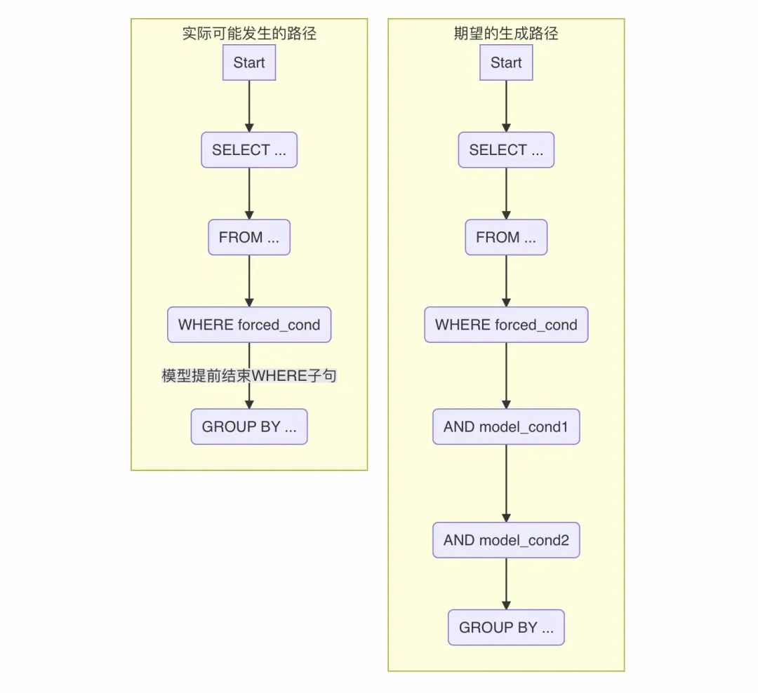 我们观察到,当强制模型生成某个特定结构(比如 WHERE fstatus=1)后,模型有时会“认为”该部分的任务已经完成,不再继续生成其他本应由它根据上下文补充的内容(比如 AND fdate >= '2023-10-01'),而是过早地跳到下一个语法环节(如 GROUP BY)。