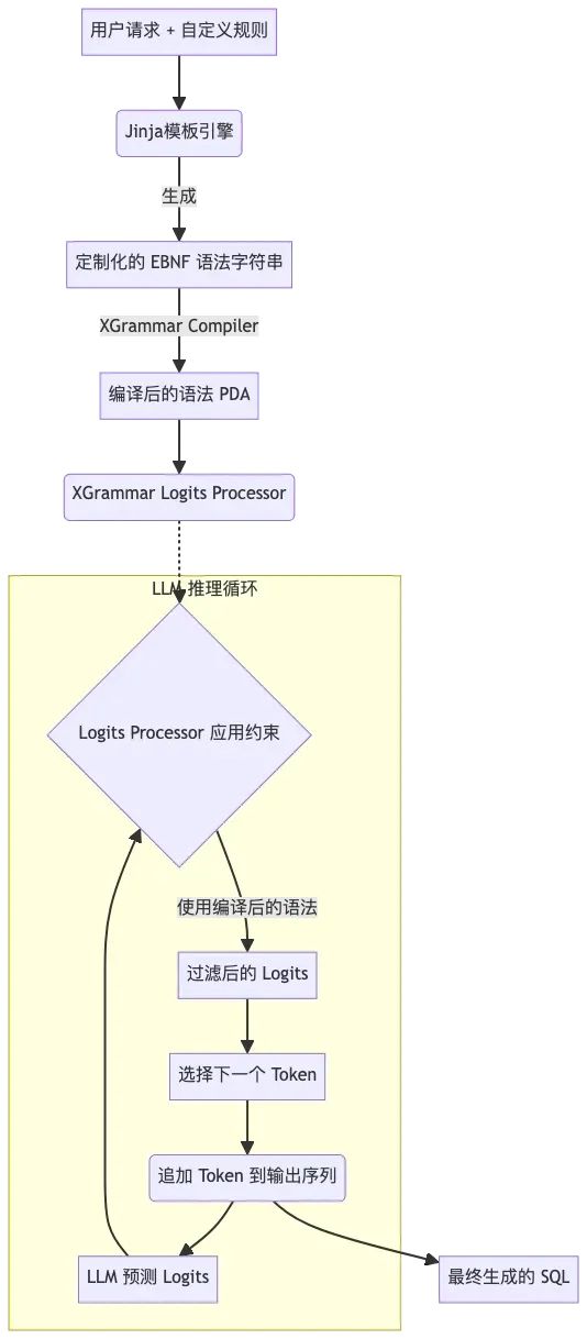 图 3: 基于 XGrammar 和 Jinja 的动态约束 SQL 生成流程