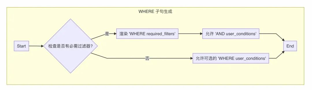 WHERE子句中包含这些条件(这个配置会通过 Jinja 模板,在生成的 EBNF 语法的 WHERE 子句规则里,强制加入这些默认条件),相当于告诉模型:“别忘了,我们查数据有基本法!”