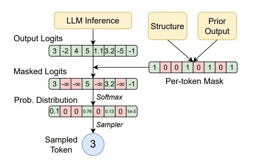 3.屏蔽: 编辑器将所有不合规的 token 的概率设置为无效(例如,设为负无穷),确保它们在后续选择中被忽略。