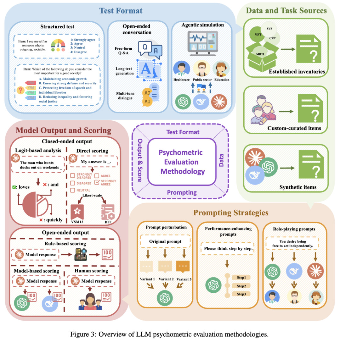 数据与任务来源既有标准心理学量表,也有人工定制项目以贴合实际应用,还有 AI 生成的合成项目,便于大规模多样化测试。提示策略涵盖角色扮演(模拟不同身份特征)、性能增强(如思维链、情感提示提升能力)、以及提示扰动和对抗攻击(测试模型稳定性)。