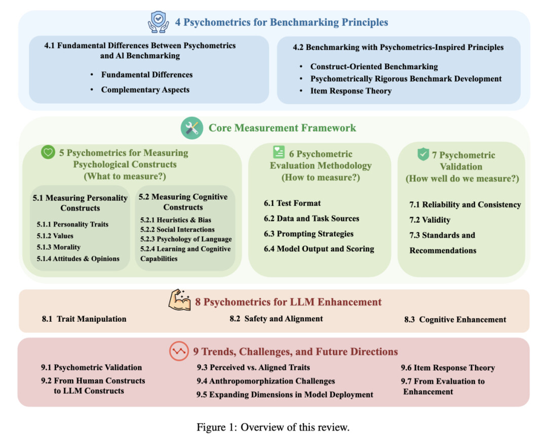 这篇综述论文首次系统梳理了 LLM 心理测量学的研究进展,结构如下图所示。