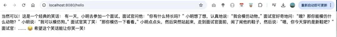 public String hello(@RequestParam(value = “input”, defaultValue = “讲一个笑话”) String input){return chatClient.prompt(input).call().content();