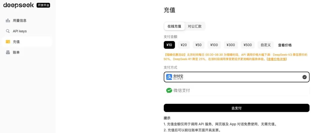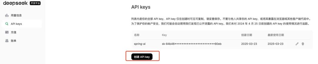 进入DeepSeek开放平台 https://platform.deepseek.com/usage,完成账号的注册与充值(开发学习时可以少充一点费用),点击 API keys创建个人专属API key 并保存下来。