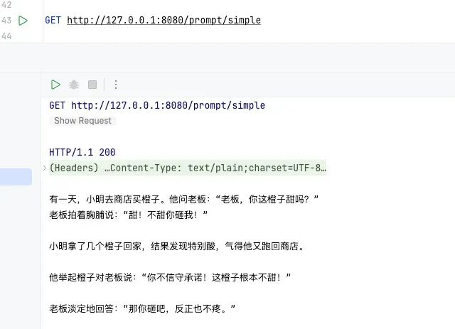 @GetMapping(value = "/hello/stream", produces = "text/html;charset=UTF-8") public Flux<String> helloStream(@RequestParam(value = "input", defaultValue = "讲一个笑话") String input){return chatClient.prompt(input).stream().content();