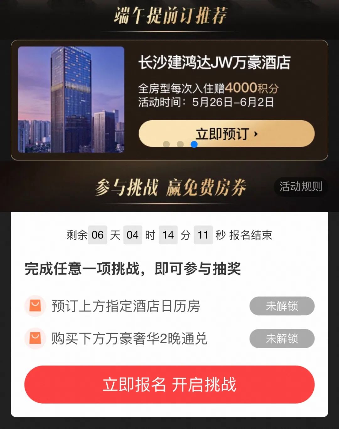 奢华酒店的活动:报名后预订闪促日历房+购买指定套餐,完成这两个任务可以抽取「苏州丽思卡尔顿、厦门W、长沙JW万豪」的免费券。