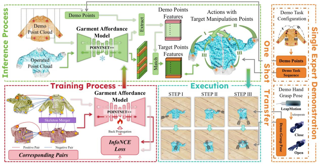 提出利用衣物结构对应关系,仅基于单次专家示范,自动生成多样化的操作轨迹,大幅减少人工成本。