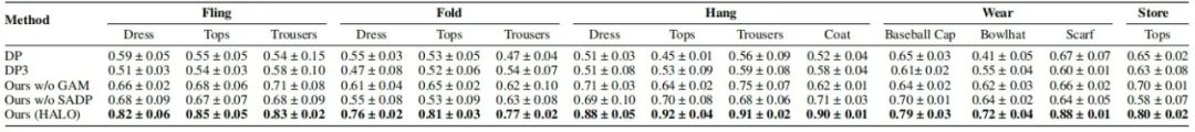 尽管存在上述变化,HALO 中的 GAM 模块依然能够准确定位抓取区域,而 SADP 模块则根据衣物和交互物体的状态生成自适应操作轨迹,确保操作动作既稳定又具备良好的泛化能力。