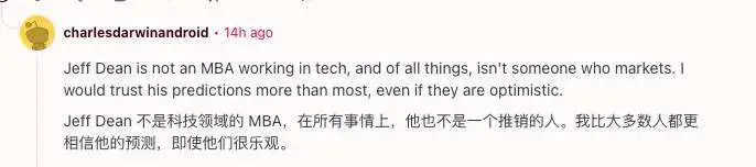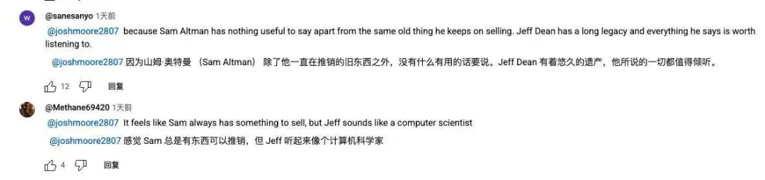 作为技术界最具影响力的人物之一,Jeff Dean 的这番言论一经发布,迅速在业内引发热议。虽然此前包括 Sam Altman 在内的不少业内人士也曾表达过类似观点,但 Jeff Dean 的话语分量显然不同。正如有网友所说:相比那个总在“兜售”某种概念的 Sam Altman,Jeff Dean 更像是一位脚踏实地的计算机科学家——他说出的每一句话都更显严谨与深度,值得我们认真倾听和思考。