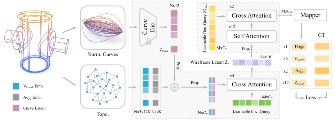 WireframeVAE 模块旨在将来自曲线编码器的潜向量、对应的顶点坐标以及邻接关系列表进行融合编码,并把它们一起映射为一个全局潜向量。为此,该方法首先通过广度优先遍历的方式对邻接列表中的线段顺序进行排序,然后使用 Perceiver 聚合模块融合曲线特征、顶点信息和拓扑连接关系,生成统一的全局潜向量。在解码阶段,该方法使用一组可学习的查询向量对该全局潜向量进行交叉注意力操作,提取各条曲线的特征,再通过特征映射器分别预测邻接关系、顶点坐标和曲线潜向量,从而完整重建线框结构。此外,通过构建差分形式的邻接关系,该方法简化了邻接列表的表示。最后,在训练中结合均方误差损失、交叉熵损失和散度损失,以确保几何信息与拓扑信息的高效融合与高质量重建。