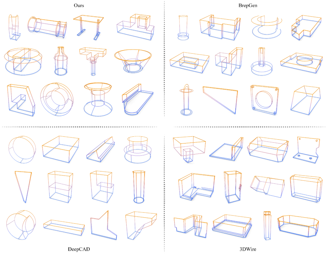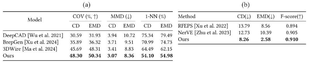 为了评估线框生成质量,该方法首先采用 CD 和 EMD 来度量生成线框与参考线框在几何形状上的相似性;随后引入分布式指标以衡量样本的多样性与一致性:COV 用于评估生成结果的覆盖率,MMD 衡量结果与真实分布的差异,1-NN 则量化两者分布的相近程度。结合这些指标,该方法与 3Dwire [Ma et al. 2024]、DeepCAD [Wu et al. 2021] 及 BrepGen [Xu et al. 2024] 在无条件生成任务上进行了对比。