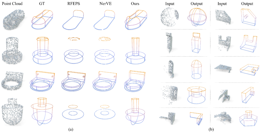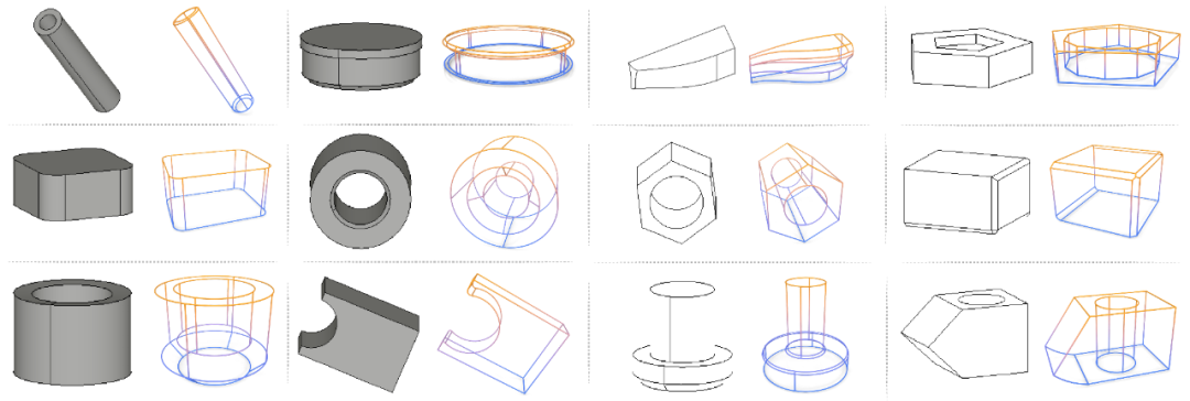三维曲线框作为对三维形状的简洁抽象表示,在形状简化 [Mehra et al. 2009]、曲面重建 [Pan et al. 2015] 及交互式设计 [Gal et al. 2009] 中具有重要意义。然而,早期方法多依赖高质量点云提取角点或边缘 [Liu et al. 2021; Zhu et al. 2023],缺乏对线框的拓扑重建;最新 B-rep 生成方法如 SolidGen [Jayaraman et al. 2023]、BrepGen [Xu et al . 2024] 虽然可以建模顶点、边、面,但主要面向规则几何,对不规则形状支持不足,且采用几何与拓扑分离的建模方式,容易引入误差。