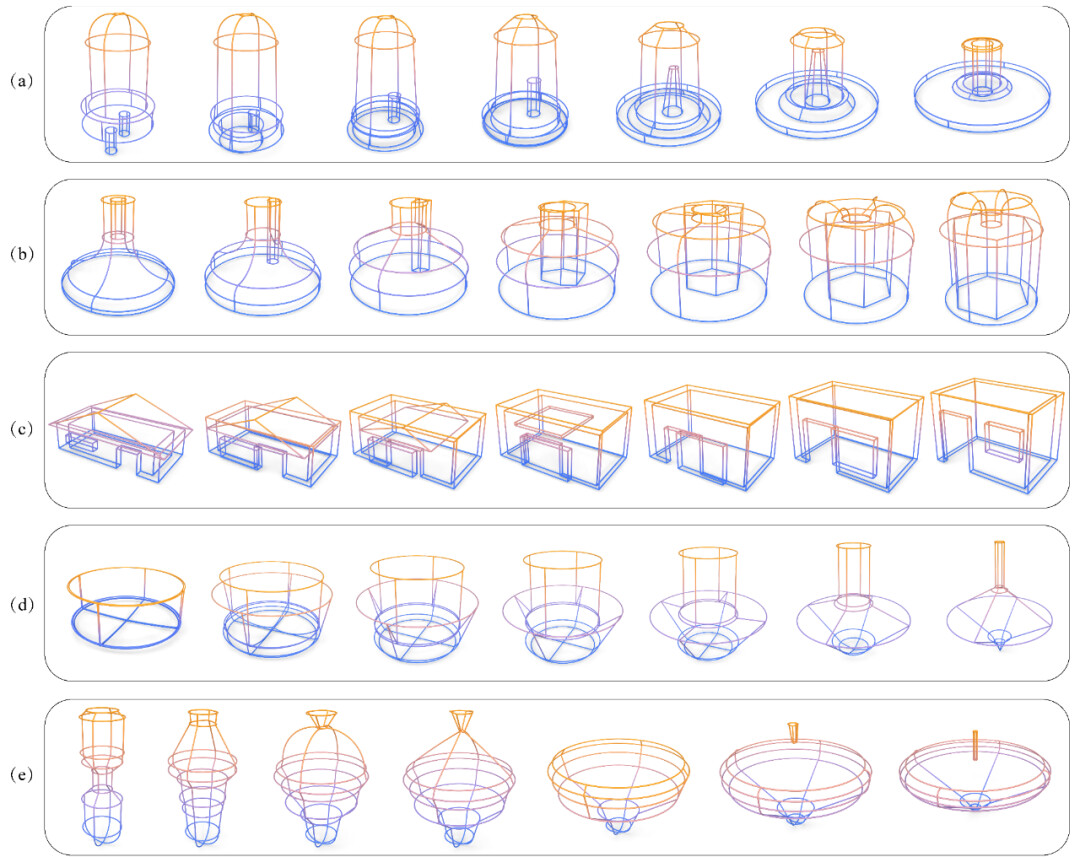 在潜空间插值实验中,该方法实现了不同线框之间的平滑过渡。该方法首先提取不同线框对应的潜向量,然后通过球面线性插值生成中间潜在表示序列,再解码为相应的三维曲线框。结果表明,该插值过程不仅在几何细节上保持了高保真度,还成功捕捉了起始与目标线框之间的拓扑变化,展示了该方法在直观编辑与交互式操作等应用场景中的潜在价值。