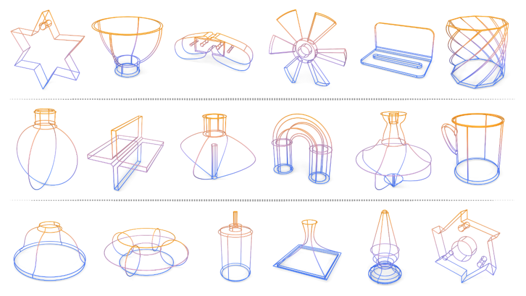 它创新地将几何曲线与拓扑结构统一编码至连续潜空间,实现了不同三维曲线框之间的平滑过渡。这不仅拓展了三维线框建模的边界,也为三维形状生成和交互式设计开启了全新的想象空间。
