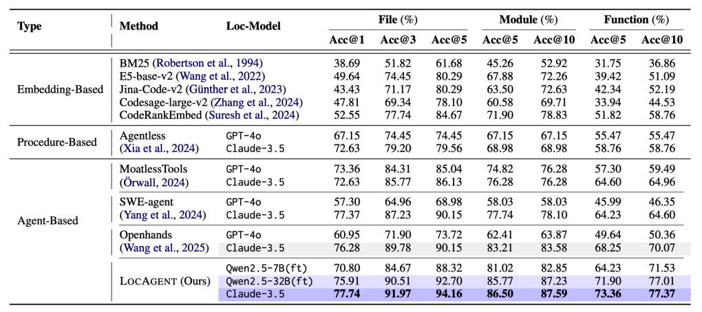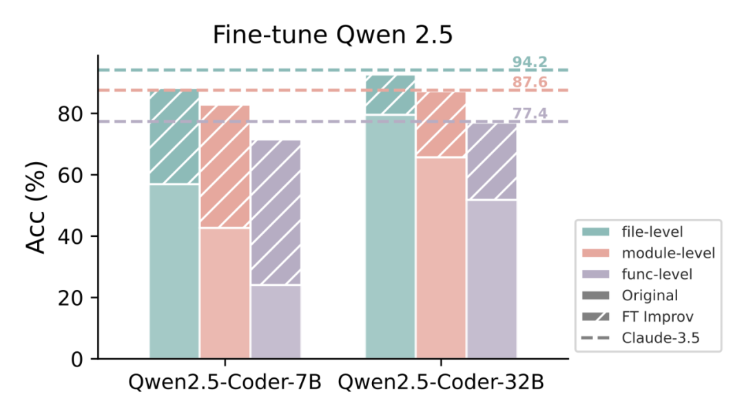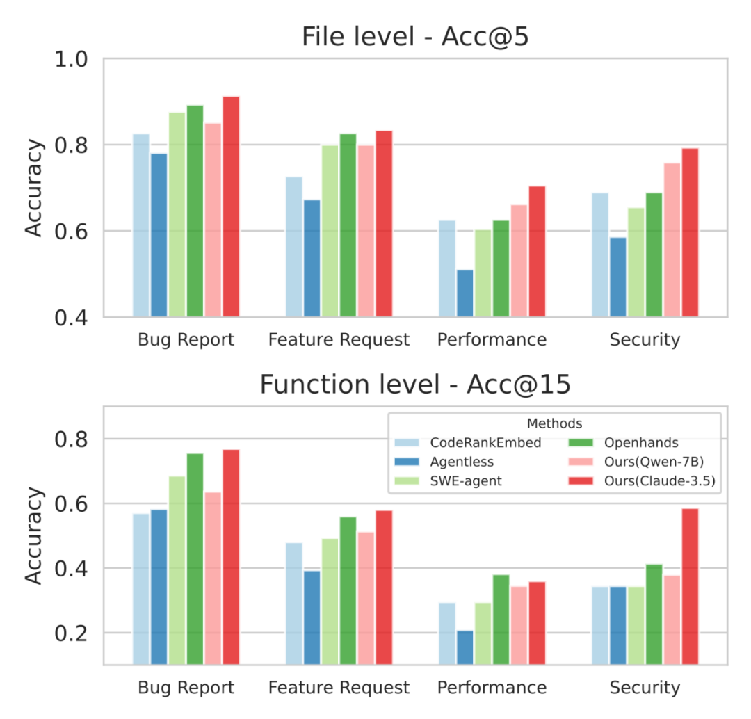 具体而言,微调的 Qwen2.5-7B 模型,LocAgent 在 Loc-Bench 四类场景下的平均文件级 Acc@5 为 76.8%,函数级 Acc@15 为 46.9%,已接近 SWE-Agent 搭配 Claude-3.5 的表现(后者函数级约 45.4%)。进一步将 LocAgent 与 Claude-3.5 结合后,文件级平均准确率可提升至 81.1%,在四类任务中几乎全面超越其他方法。