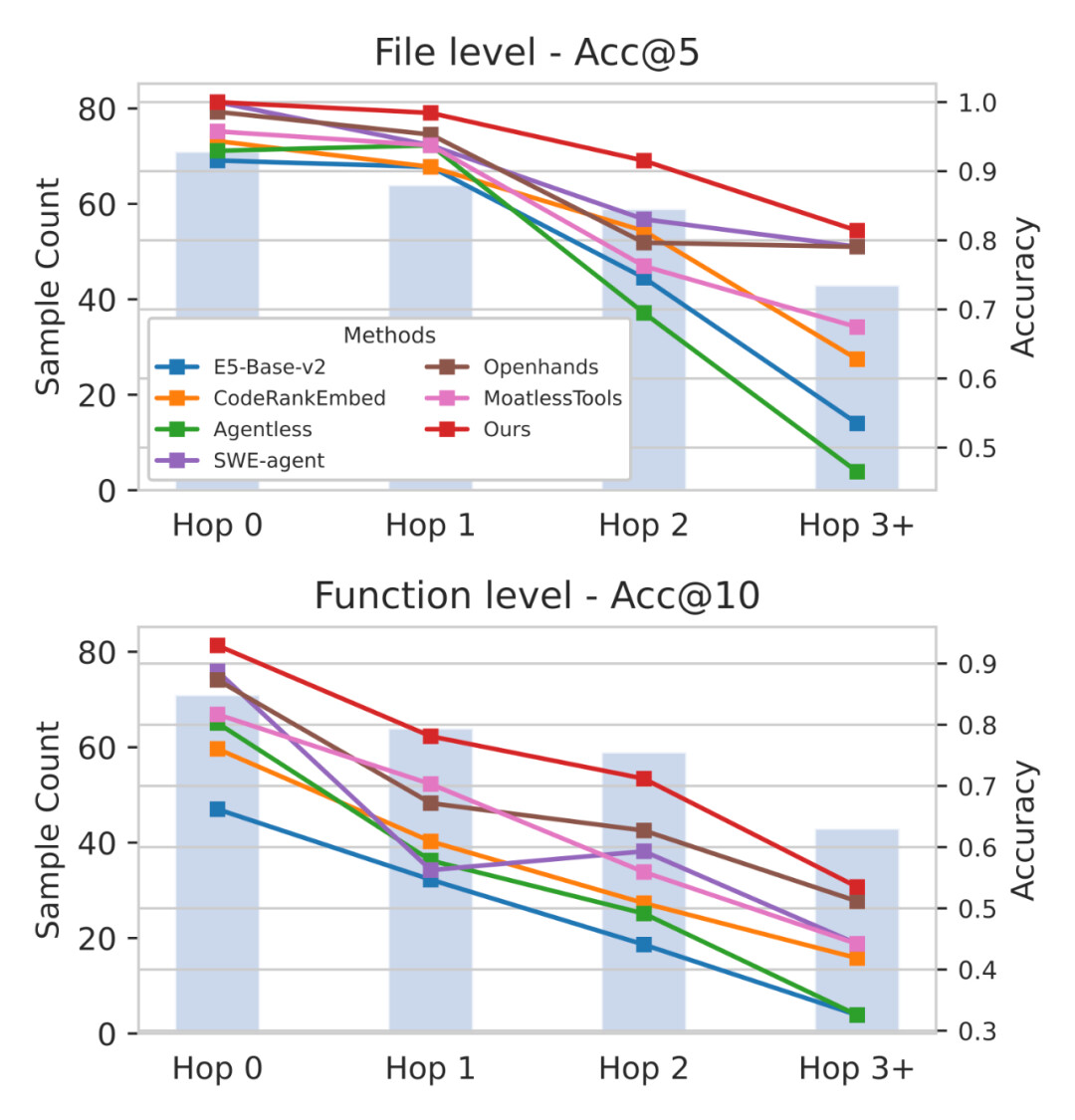 相比之下,传统检索方法在需要两跳以上时几乎失效,在函数级定位上即使目标函数名字就出现在查询里,有时都找不到(因为它们往往把查询当做整体,无法拆解处理细节)。