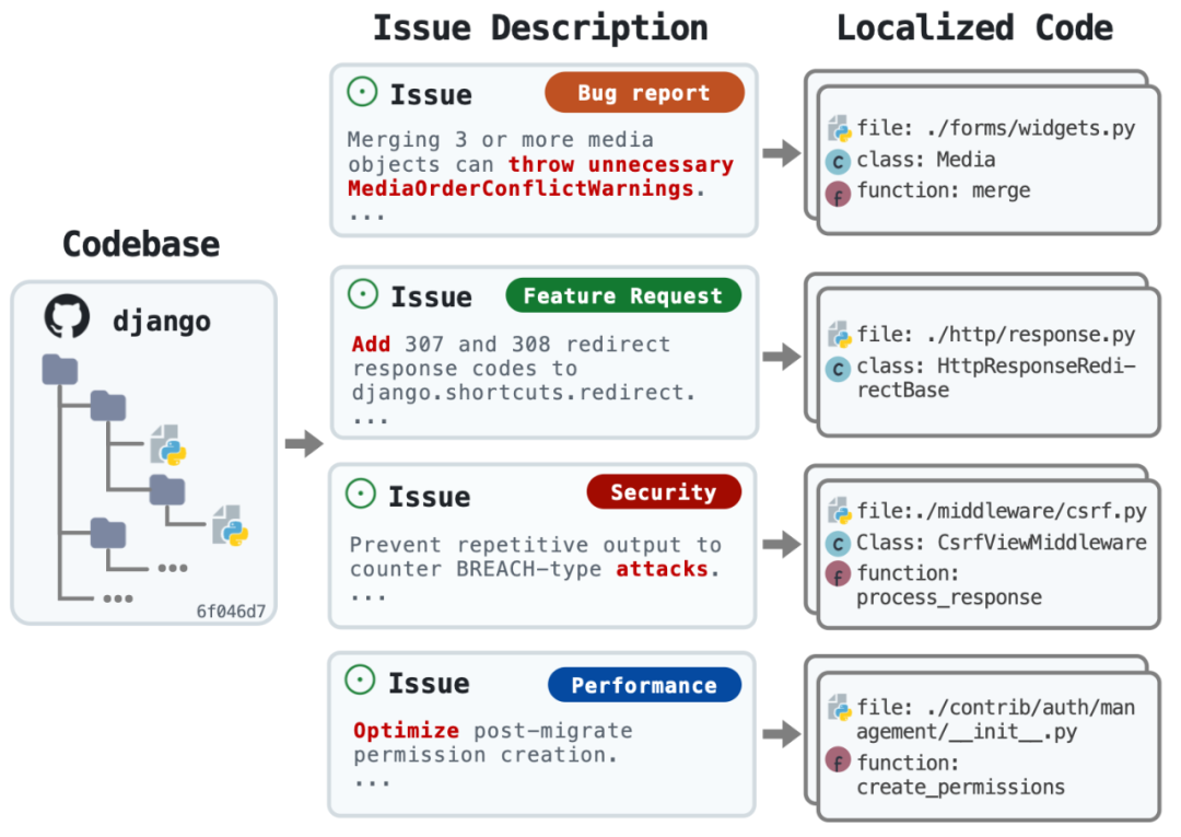 图 1:给定一个代码库(左)和问题描述(中,包含四种场景的示例),代码定位需要识别出需要修改的相关代码位置(右),包括具体的文件、类和函数。LocAgent 旨在让 LLM Agent 自动完成这一过程。