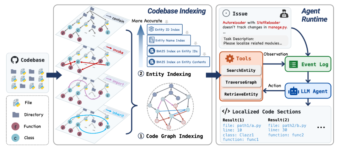 如图 3 所示,LocAgent 首先将代码库解析为一个异构图表示,图中包含多种类型的代码实体及其依赖关系。在此基础上,系统构建了分层稀疏索引,用于支持高效的内容检索与结构化探索。借助这些索引,LocAgent 能够结合图结构与工具接口,执行由 Agent 驱动的逐步搜索过程,精准完成代码定位任务。