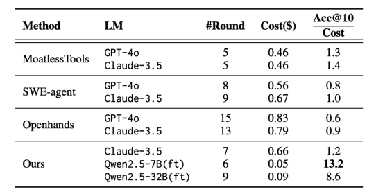 具体来看,使用 Claude-3.5 等商用 API 模型时,每个 Issue 的平均处理成本约为 $0.66;而使用本地部署的 Qwen2.5-32B 模型,成本降至约 $0.09,降低了 86%。若进一步采用 7B 的小模型,处理成本可低至 $0.05,仍能保持优于大多数方法的性能。从函数级准确率与成本的比值来看,微调后的 Qwen-2.5-7B 是性价比最高的方案,其效率优于所有商用模型;Qwen-2.5-32B 次之,也显著优于 Claude-3.5。这表明,结合 LocAgent 框架,开源模型不仅具备性能竞争力,更具部署经济性。