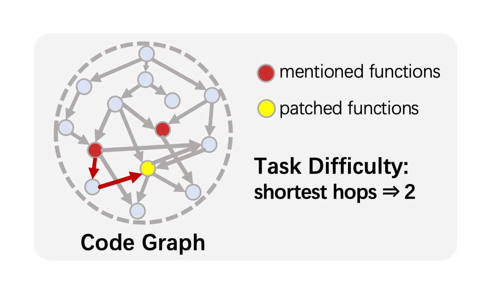图 2: 图中红色节点表示问题描述中明确提及的函数,黄色节点表示实际需要修改(修补)的函数。任务难度定义为代码图中从提及函数到目标修补函数之间的最短路径长度(最少跳数),图示例中任务难度为 2 跳。