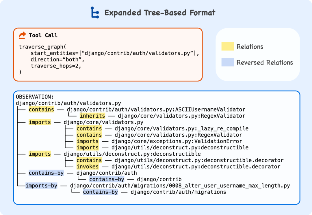 TraverseGraph:该工具在代码图上执行类型感知的广度优先搜索。Agent 可以指定起始的实体 ID,以及希望遍历的方向、步数(hops)、实体类型和关系类型等参数。工具会在图中从起点出发按照要求走指定步数,返回遍历到的子图结构。通过设置不同的类型过滤,Agent 可以灵活地探索比如「沿调用关系向下追踪两步」或「查看从某类出发的继承层次」等等。值得一提的是,TraverseGraph 将返回的子图格式化成一种树状结构文本(见图 5),以便 LLM 更容易理解关系拓扑。