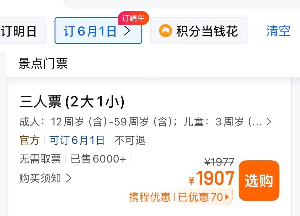 这个套餐非常值得一看,首先看一下门票价值,比如这周末的六一,2大1小门票1907元。