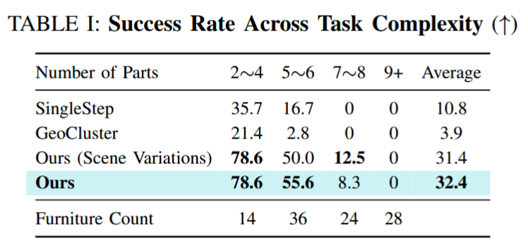 在 50 件简单至中等难度家具的仿真测试中,Manual2Skill 达成 58% 成功率,显著超越现有启发式方法,验证了层级化装配图、位姿估计与运动规划结合的有效性。