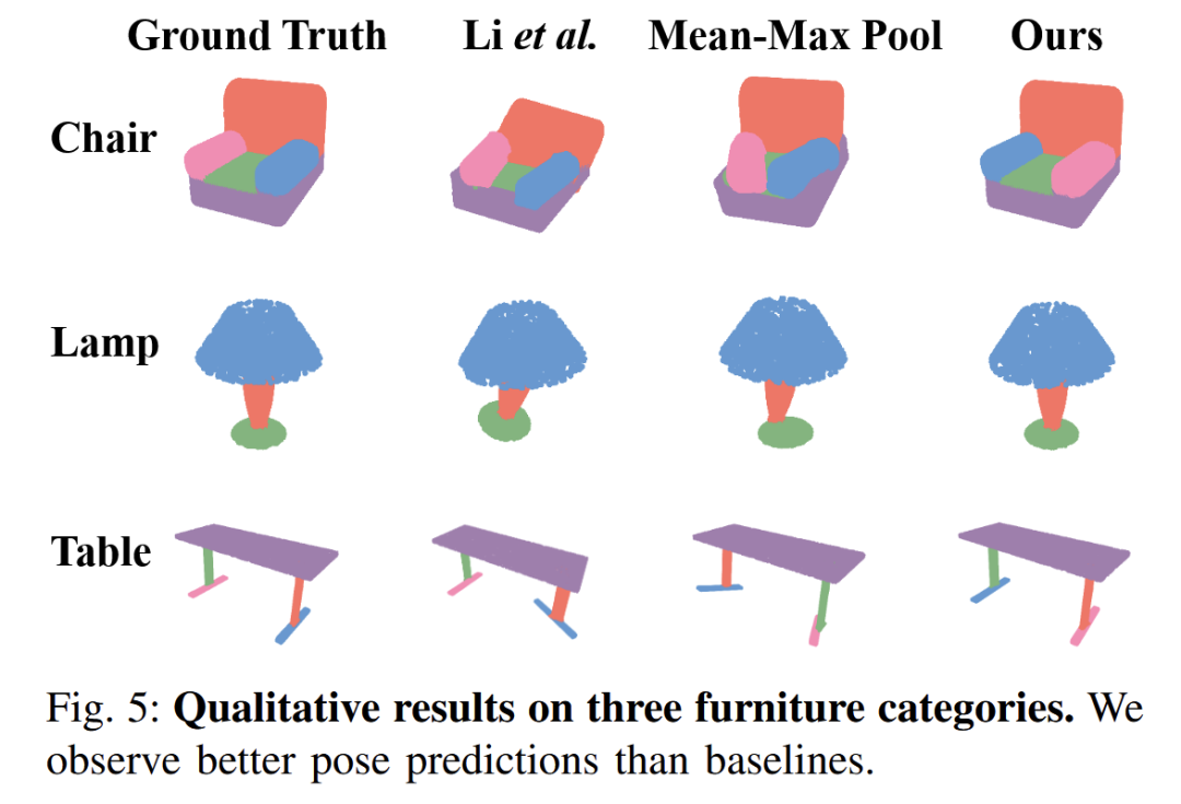 同时我们还发现,尽管家具的形态有很大差别,但其基本部件的连接方式(比如板和棍的连接)较为固定,这种分步预测的方法能使模型更好地学习到这种基本连接方式,从而对测试集的物体实现更高的预测精度。