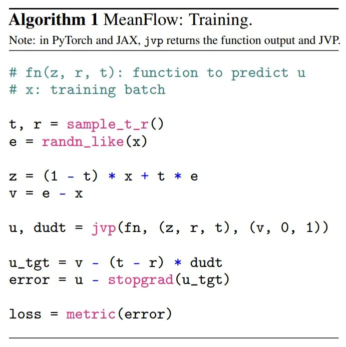 基于这一基本概念,本文训练了一个神经网络来直接建模平均速度场,并引入损失函数来奖励网络满足平均速度和瞬时速度之间的内在关系。