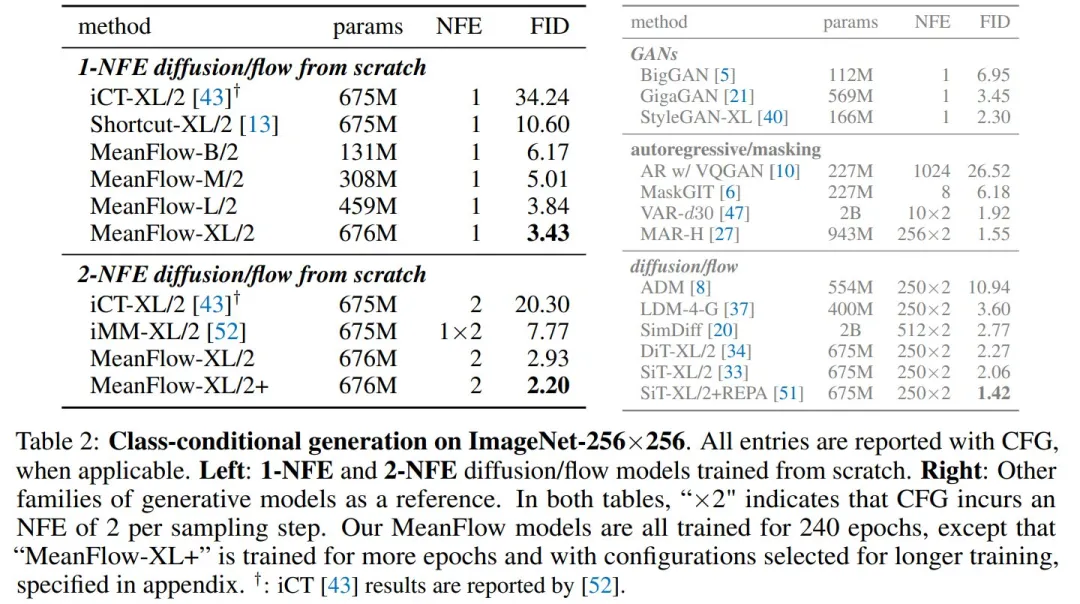 在 2-NFE 生成中,MeanFlow 实现了 2.20 的 FID(表 2 左下)。这一结果与多步扩散 / 流模型的领先基线模型相当,即 DiT (FID 2.27)和 SiT (FID 2.15),两者的 NFE 均为 250×2(表 2 右)。