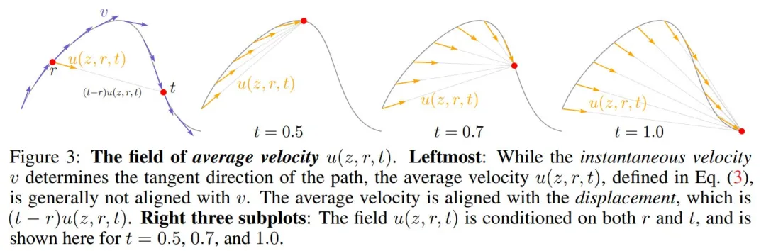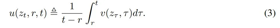 文章提出使用平均速度(在时间间隔内的位移与时间的比值)来代替流匹配中通常建模的瞬时速度。然后本文推导出平均速度与瞬时速度之间存在一个内在的关系,从而作为指导网络训练的原则性基础。