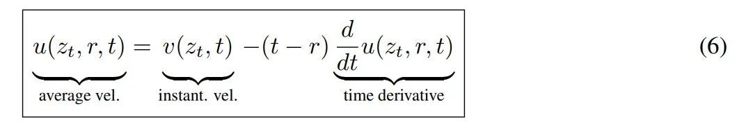 这个方程称为 MeanFlow 恒等式,它描述了 v 和 u 之间的关系。