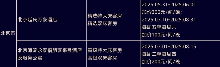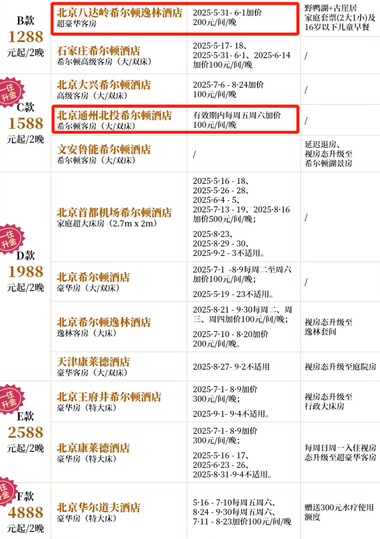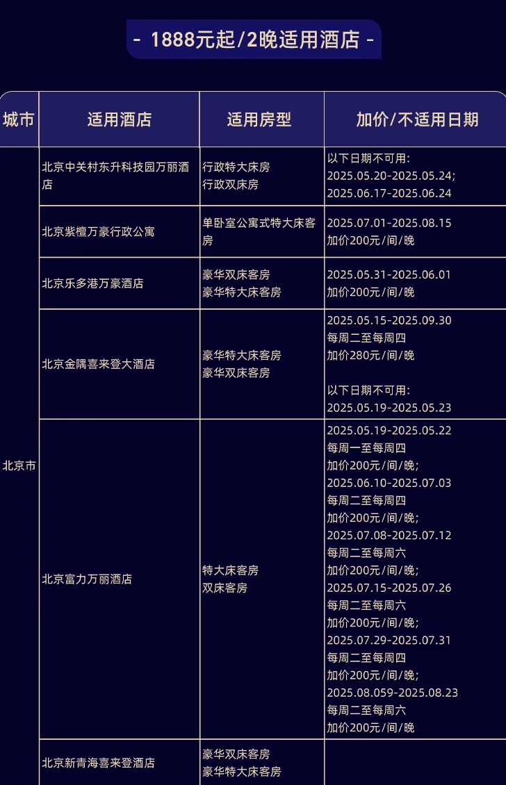 1888元/2晚就多了,其中多乐港万豪暑假不加价、北京新青海喜来登全程不加价: