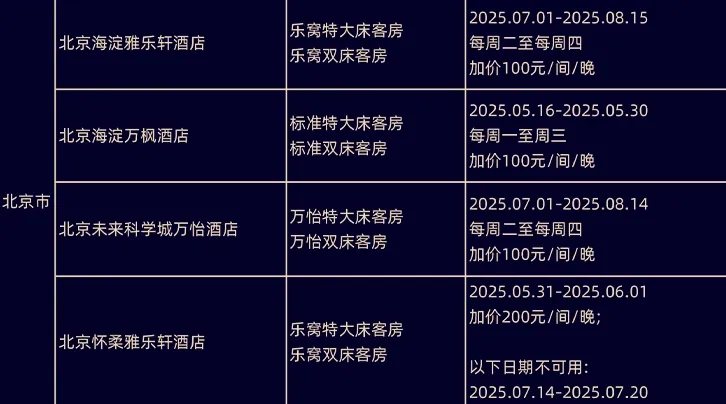 比如,888元/2晚有北京大兴机场万枫(全程不加价)、1188元/2晚有下面4家,周末都不加价: