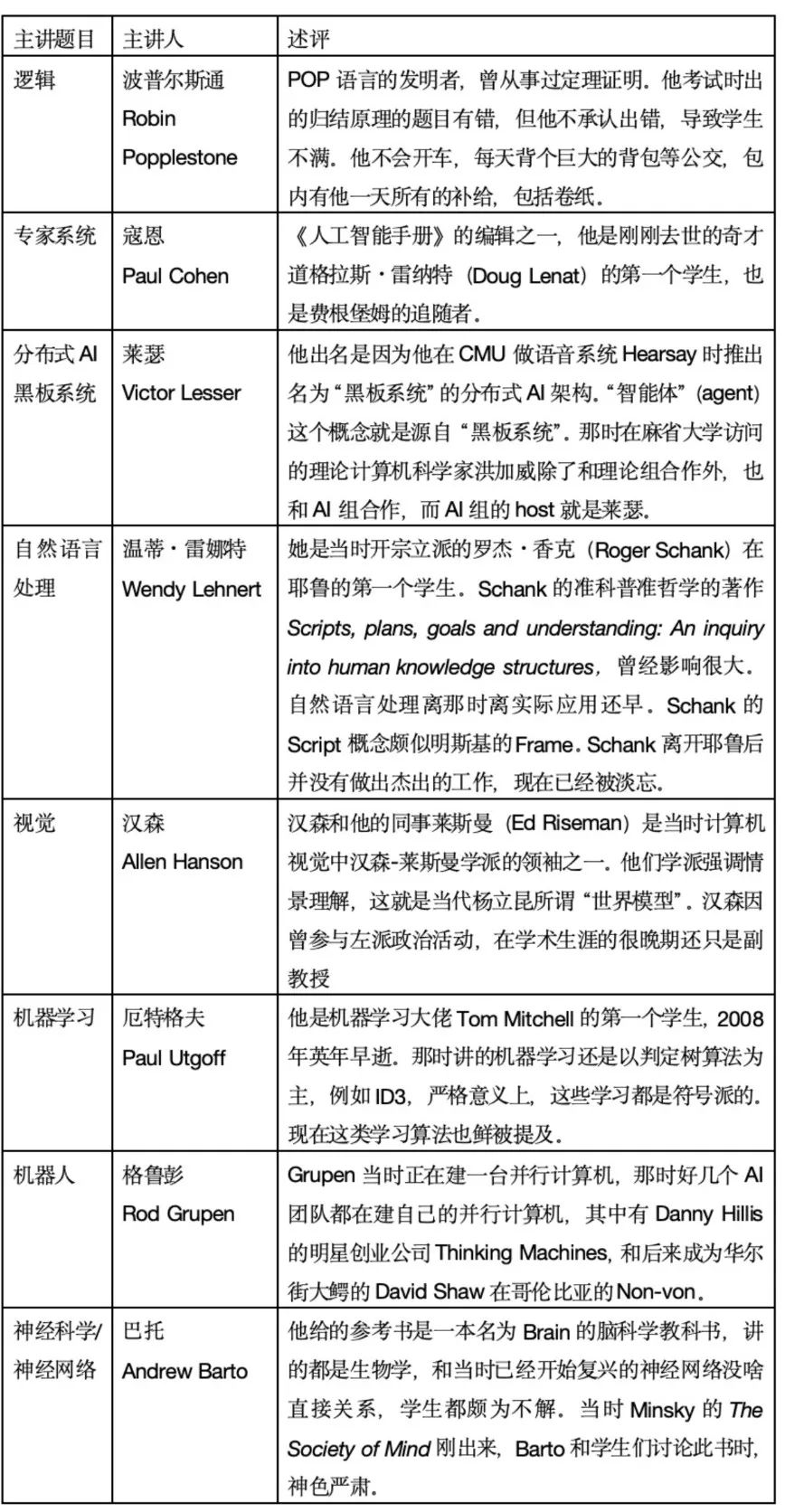 1980年代末的某一学期,麻省大学的一学期人工智能课程独树一帜,由计算机系的所有人工智能教授联合开,每人负责一个主题(如下表),主要参考书目是费根保姆和寇恩等主编的《人工智能手册》,每个老师也会有自己的教辅材料。计算机系如此开课只此一回,但让我赶上了。