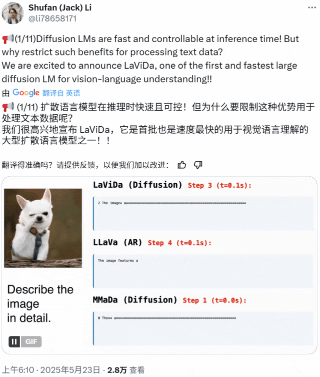 LaViDa,一个基于扩散模型的高速可控多模态视觉-语言模型,在视觉理解和文本生成方面表现出强大的竞争力。