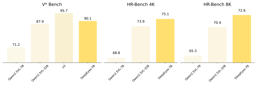 3. 端到端联合优化:工作流方法通常对各子模块独立优化,容易陷入次优。DeepEyes 通过端到端强化学习实现全局联合优化,显著提升整体性能。