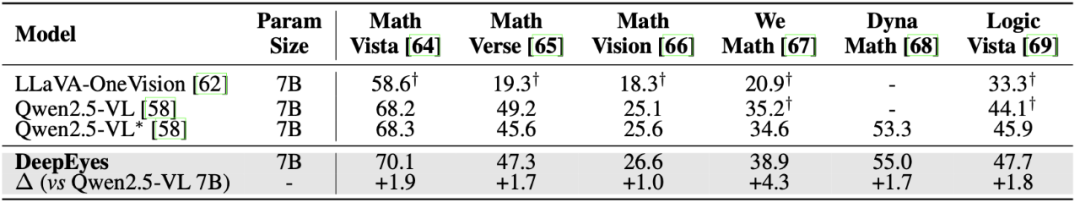 此外,除了视觉感知,DeepEyes 的数学推理能力也有明显提升,展现出多模态模型在跨任务能力上的潜力。