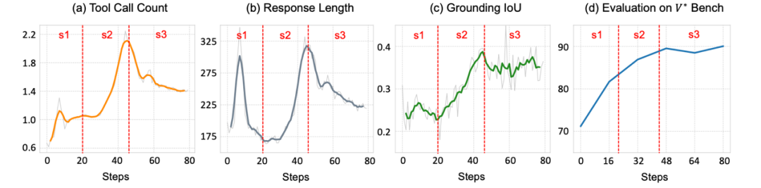 在上述奖励函数的激励下,DeepEyes 将在学习用图像推理的过程中,从最开始的「盲目尝试」,再到后期的「有效调用」,呈现出了与人类类似的学习模式。具体而言,学习过程可以分为三个阶段: