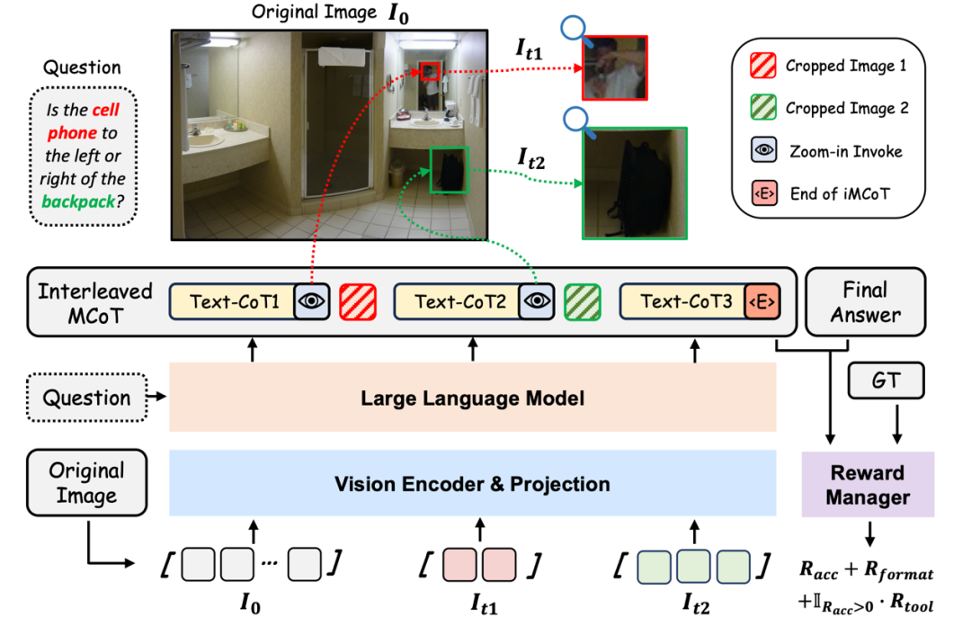DeepEyes 的架构与传统多模态推理模型一致,但在推理流程上引入了 “自驱动视觉聚焦” 机制。推理起始阶段,模型首先基于文本内容构建初步思维链。例如,在判断 “手机与背包的位置关系” 这一问题时,模型会生成内部推理如:“需要确定手机与背包的位置,可能需在图像中定位相关物体”。随后,模型根据推理进展判断是否需要图像辅助信息。若问题涉及小物体、模糊区域或细节不清晰的区域,模型将自主生成边界框坐标,裁剪图像中可能包含关键信息的区域(如手机和背包位置),并聚焦这些区域进行深入分析。裁剪图像随后以自回归方式重新输入模型,作为新的视觉证据,与现有文本推理共同作用,驱动后续推理过程更加准确、具备视觉上下文感知能力。