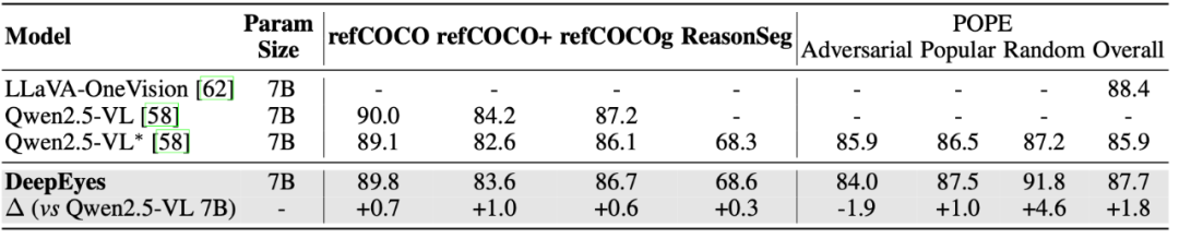 值得一提的是,DeepEyes 在无需调用任何外部工具的情况下,便具备出色的图像定位与理解能力,这些能力完全由模型自身学习获得。同时,当需要更高精度时,DeepEyes 也可以选择调用工具对图像细节进行确认,从而在降低幻觉方面取得改进。