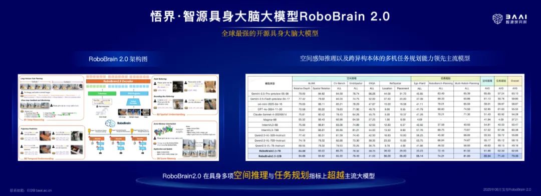 与 RoboOS 2.0 配套的具身大脑 RoboBrain 2.0 成为目前全球性能最强的开源具身智能大模型,在任务规划、空间推理等多项关键指标上全面超越主流模型,进一步巩固智源在具身智能生态中的领先地位。
