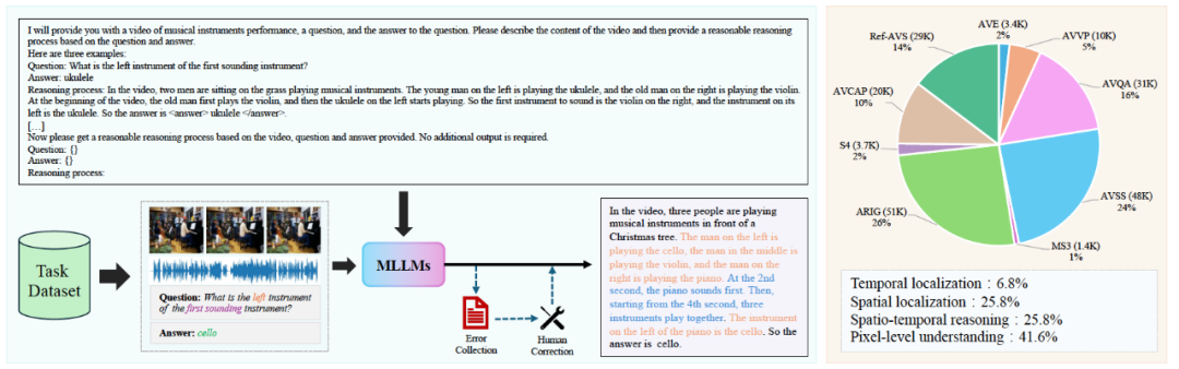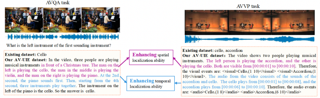 图 1 展示了具体的构建过程以及对数据集的统计分析,通过 in-context learning 的方式利用现有的强大的多模态大模型进行标注,从不同任务中的数据中获取音视频场景,为了保证结果的准确性和推理过程的合理性,原有数据的标签也作为输入,让 Gemini 1.5 Pro 针对该场景输出带有时序和空间等信息的显示推理过程。为了保证数据的质量,最终再由人工进行检查纠正。在训练过程中这些细化后的标签能够鼓励模型准确理解视听场景内容并输出相应的时空信息,以此来增强模型特定的能力,从而帮助到其它依赖这些特定能力的任务。图 2 展示了 AVQA 和 AVVP 这两种任务实现显示互助的数据样例,不同的颜色表示不同类型的时空信息,这两个任务都能够受益于增强后的空间定位和时序定位能力。