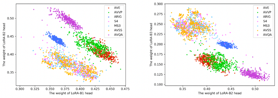 为了进一步证明任务间显示互助的过程,本文对多个 LoRA Head 进行了可视化分析实验。在推理过程中,对于每个任务的多模态输入数据,每个 LoRA Head 会产生一个权重,权重越大,表明完成该任务越依赖于这个 Head。图 3 对比了 3 个 Head 在不同任务上的权重,左图是 B1 和 B2,右图是 B2 和 B3。可以发现两点:1)相同类型的任务对不同 Head 的依赖程度是类似的,它们对不同 Head 的依赖权重分别形成不同的簇;2)不同任务对 3 个 Head 的不同依赖性表明每个 Head 具备不同的能力。这表明模型的能力被解耦成多种不同的能力,多个任务间可能会依赖于同一种能力,因此它们可以建立相互协助的关系。