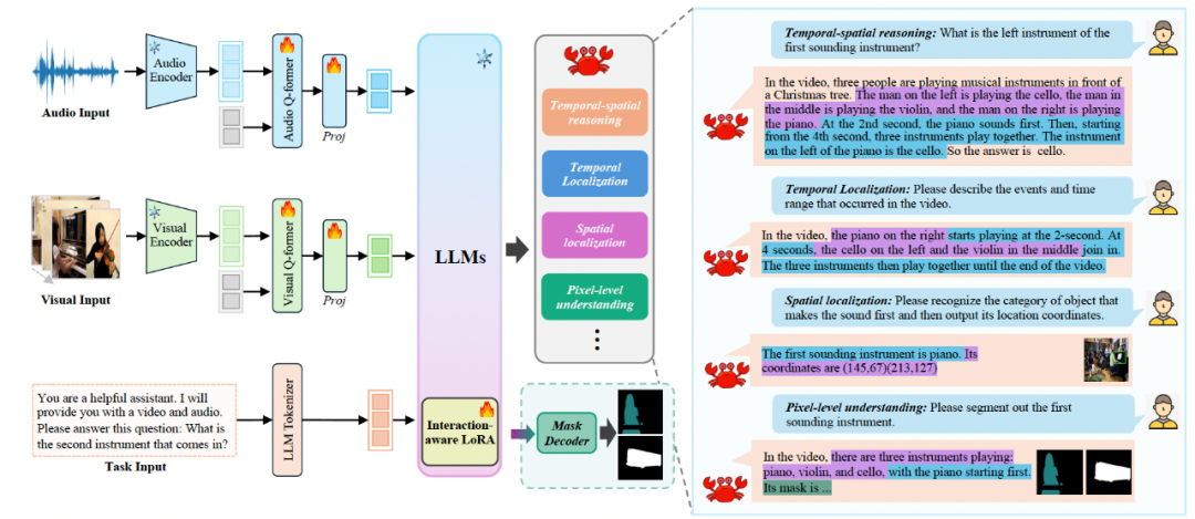 从数据的角度保证了模型可以输出带有时序信息的显示推理过程,这是从结果上对模型进行约束,显示地增强不同类型的能力,但是如何保证模型在学习过程中可以有效地学到这些不同的能力呢?为此,本文提出了一个视听场景理解的统一学习框架,图 3 展示了模型的整体架构,主要包括三个统一的多模态接口,分别用来处理 audio, visual 和 segmentation mask 数据,一个具有 interaction-aware LoRA 结构的大模型,用于在学习过程中有效学习数据交互的不同层面从而实现任务间的显示互助。