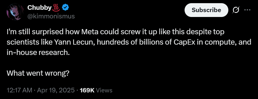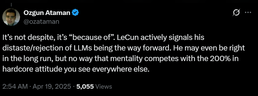 因而,今年 4 月,当 Meta 因 Llama 4 发布后表现不佳招致种种“落后”质疑时,就有业内人士直接将根源归咎于其“对 LLM 前进方向的厌恶 / 拒绝”心态。还有网友表示,“有像 Yann Lecun 这样的顶级科学家、数千亿资本支出用于计算资源以及内部研究,Meta 竟然还能搞砸成这样。”