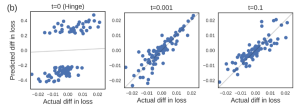 和实际的损失变化仍然高度相关。这说明影响函数在实际复杂的训练场景中(如非凸优化和非收敛情况)具有一定的鲁棒性。