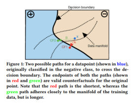 对蓝色的点X进行反事实操作,即使红色的点CF1与X更近,然而由于它不处于数据流型之中,模型会更倾向于用绿色的点CF2来进行解释。