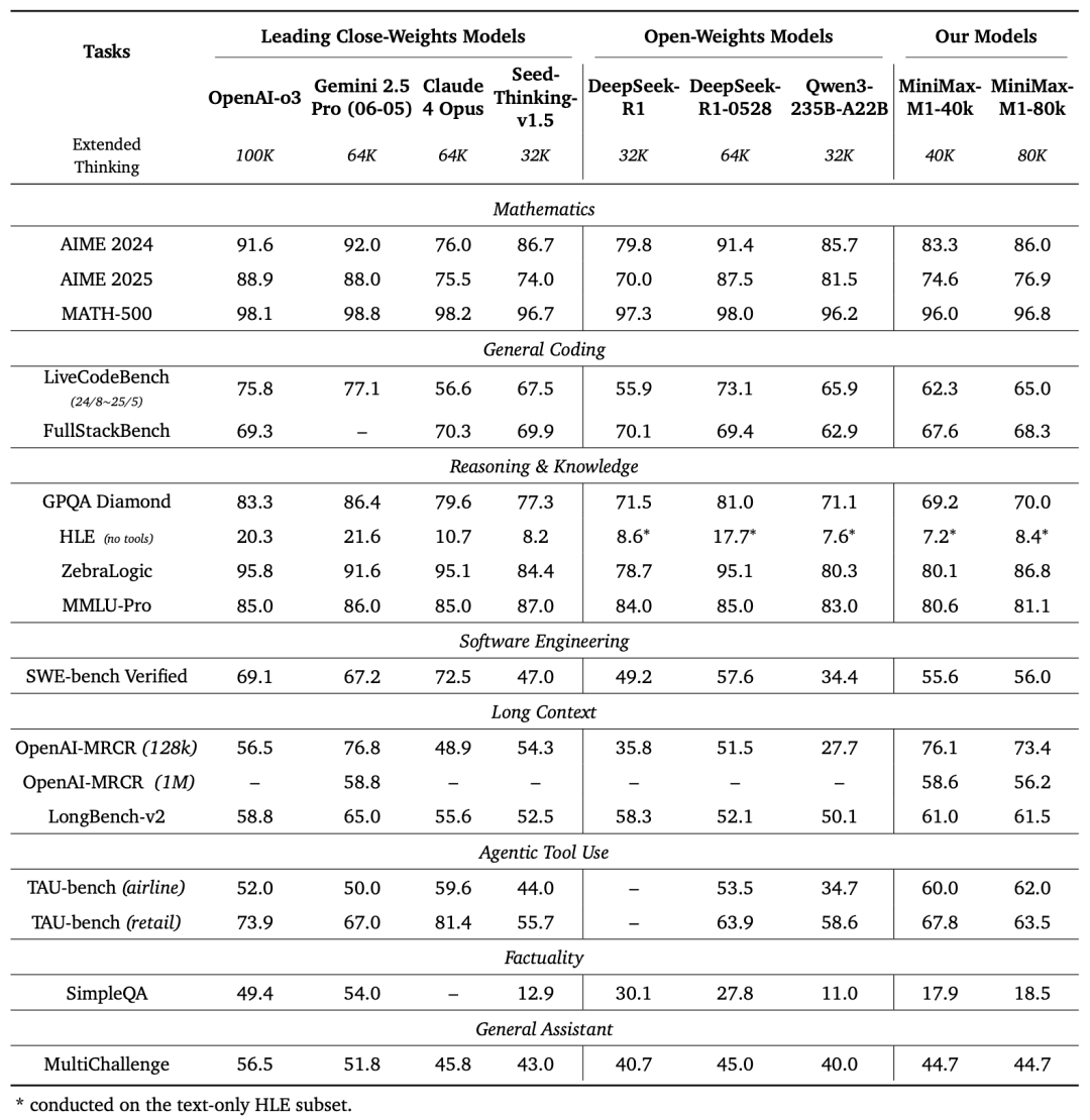 对领先的商业模型与开源模型在竞赛级数学、编程、软件工程、智能体工具使用以及长上下文理解等任务中的基准性能进行对比评估。其中,MiniMax-M1 结果使用其 MiniMax-M1-80k 模型。