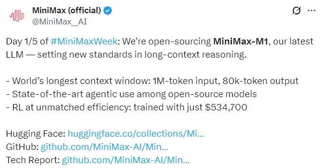 其中,MiniMax 启动了「MiniMax Week」,并在第一天开源了其最新的长上下文推理 LLM——MiniMax-M1。该模型支持全球最长的上下文窗口,包括 100 万 tokens 输入、8 万 tokens 输出。